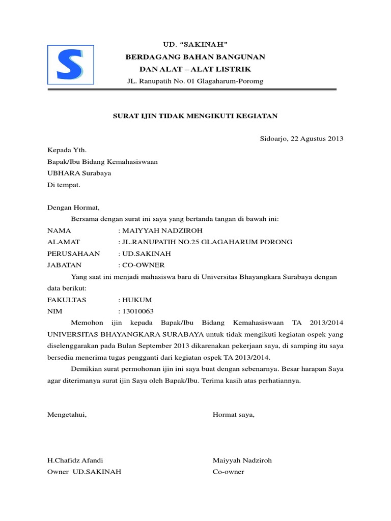 Demikian surat permohonan ini saya buat, semoga bapak/ibu dapat memaklumi dan berkenan memberikan izin. Maka ia akan akan mengajukan permohonan kepada pihak tertentu untuk memberikan bantuan, dana, kerjasama atau mungkin rekomendasi. Izin tidak mengikuti kuliah lampiran : Surat permohonan sendiri dapat bersifat resmi atau pun tidak resmi. Santri siap guna daarut tauhiid bandung gegerkalong girang no. Kepala kantor pelayanan perizinan jakarta selatan. Hal tersebut menyebabkan adanya rasa saling ketergantungan atau. Surat yang resmi biasanya ditujukan kepada suatu instansi. Misalnya, permohonan izin tidak dapat masuk kerja dikarenakan keperluan menikah. Terima kasih banyak atas pengertian yang diberikan kepada saya. Melalui surat ini saya mengajukan permohonan izin tidak masuk kerja dengan alasan… seperti yang telah dibicarakan sebelumnya silakan menghubungi saja jika ada sesuatu yang dibutuhkan selama saya tidak hadir bekerja di kantor. Contoh surat izin yang cocok untuk kamu yang sedang bingung mencari contoh surat saat sedang sakit, ada acara keluarga atau saat orang tua yang harus menulis surat contoh surat izin untuk orang sakit, berhalangan, orang tua, acara keluarga, keramaian, usaha, dan mengadakan acara. Contoh surat permohonan berbagai keperluan yang benar.